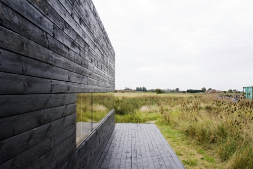 Velika staklena klizna vrata otvaraju dnevnu sobu ka tremu koji nadgleda poljoprivredni krajolik zelenih trava i roze cvetova. Trem koji se obavija oko kuće je takođe obojen u crnu boju, i nudi spokojan prostor za odmaranje na suncu.