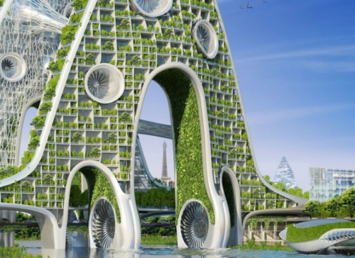 Futuristička vizija Pariza predviđa korišćenje prostora i materijala na najefikasniji mogući način - fasade u obliku saća na neboderima služe kao solarni generatori koji sakupljaju sunčevu energiju i proizvode biogorivo. „Filosvetla“, koja se nalaze na vrhovima nebodera, proizvode svetlost i energiju korišćenjem vetroturbina.