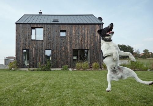 Dvovodna kuća je smeštena u Pišeli, ruralnom gradu izvan Praga, i umotana je u fasadu od ugljenisanog drveta raznih nijansi koja odaje počast vlasnikovoj ljubavi za kulinarstvom. Za razliku od svoje tamne spoljašnjosti, jednospratna kuća ima svetao enterijer sa čistim, belim zidovima i svetlim drvenim akcentima.