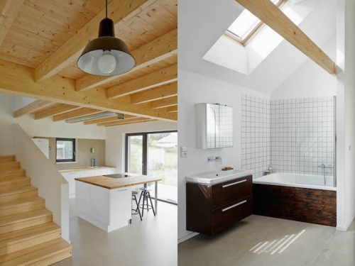 Unutra se prizemlje sastoji od otvorene dnevne sobe, kuhinje i trpezarije, dok je odvojena radna soba ušuškana iza peći na drva. Tri spavaće sobe se nalaze na drugom spratu.