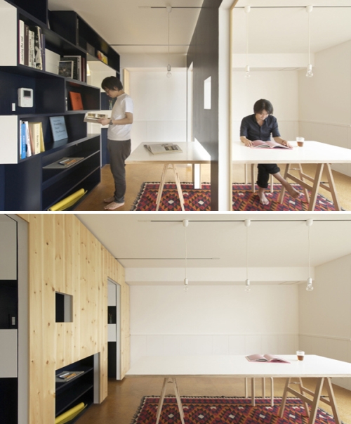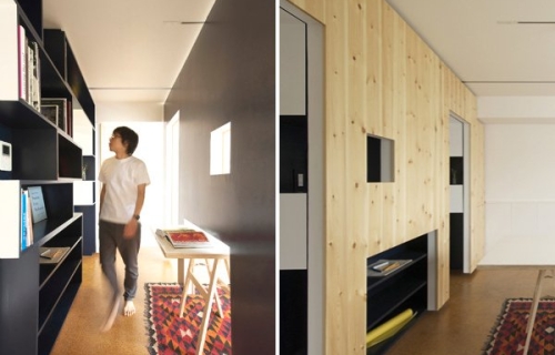 Transformišući višenamenski nameštaj je ključni element dizajna za male životne prostore, tako da su pametni trikovi primenjeni kako bi se ovaj maleni stan pretvorio u efikasnu kancelariju. Najveća soba stana je pretvorena u veliku salu za sastanke i biblioteku sa upotrebom kliznog zida.