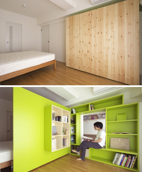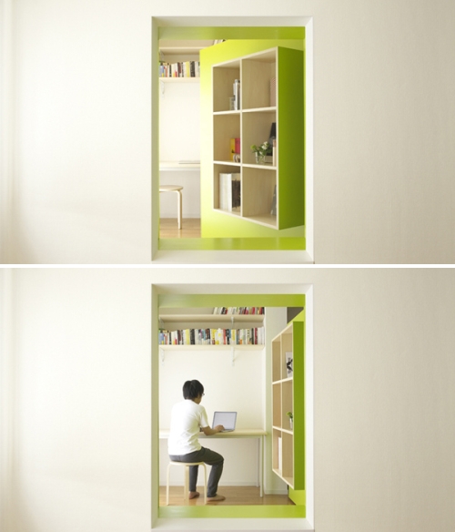 Kada se otvori, ta polica za knjige efikasno odseca prostor spavaće sobe i stvara čitaonicu kojoj se može pristupiti preko radne sobe prolaskom kroz kvadratni portal. Noću kada svi odu kućama, ljuljajuća vrata (polica) se zatvara i spavaća soba je otvorenija i spremnija za svoju normalnu funkciju.