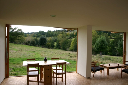 Četiri modula masivnih staklenih vrata klizi duž zidova, što omogućava da se kuća otvori kao okolnoj livadi i dovodi prirodu u enterijer. Svaki modul se sastoji od kvadrata transparentnog stakla, uramljenih u opal belo staklo postavljeno na drvenom ramu.