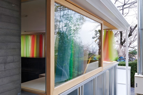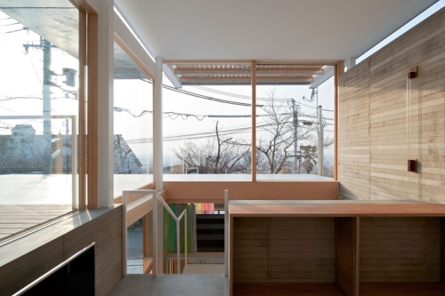 U prizemlju, uska kutija koja sadrži dnevnu sobu, trpezariji, kuhinju i dečiju sobu podržava ploču drugog sprata. Ova uska kutija se nalazi pored otvorenog parkinga, koji nosi kutiju na drugom spratu koja smešta dve spavaće sobe. Dečija soba koja se nalazi u prizemlju je posebno interesantan prostor ukrašen zavesama dizajniranim od strane Akane Morijama.