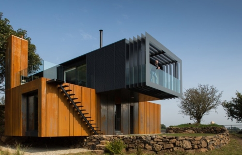 Crni čelični ram podržava sivo obložene metalne kontejnere, koji se protežu preko prizemlja stvarajući konzolni balkon. Crni balkon je pokriven sa čeličnim elementima koji smanjuju solarni dobitak u unutrašnjosti doma i nude lepe poglede na široka brda koja okružuju kuću.