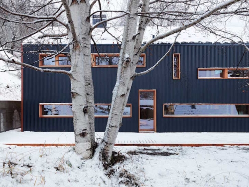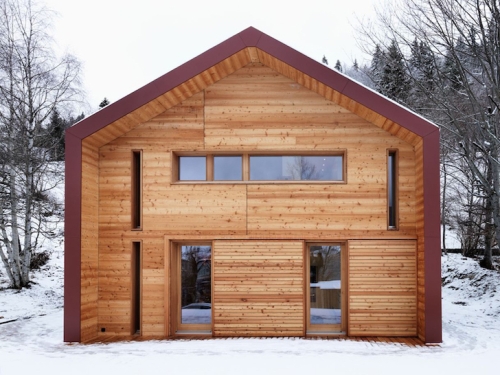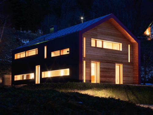 Arhitekta je zaštitio objekat od oštrih zima regiona tako što je obložio strukturu u antracit metalnu oblogu - materijal koji aludira na industrijski identitet doline kao rodno mesto švajcarskog časovničarstva. Rebrasta metalna fasada je dopunjena sa velikodušnim količinama obloga od ariša, što kući daje ugodan, domaći osećaj.