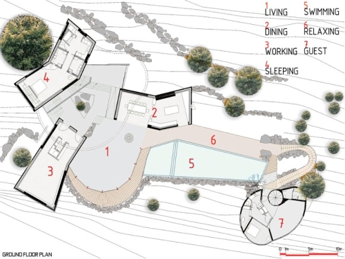 Jedan volume služi kao glavna spavaća soba i kupatilo, drugi kao kuhinja i trpezarija, a treći služi kao gostinski prostor sa susednom radnom sobom. Veliki centralni atrijum nije samo ulaz u dom, već pruža poglede od 180 stepeni na pejzaž i luku ispod. Četvrti volumen se nalazi ispod glavnog bazena i služi kao samostalna stambena zgradica.