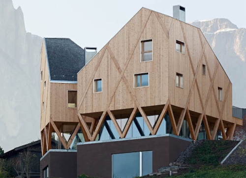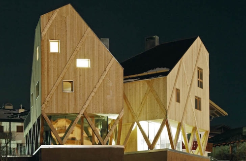 Drveni volumeni nalik alpskoj tipologiji su izgrađeni od laganog unakrsno laminiranog drvenog građevinskog sistema. Njena prepoznatljiva „V“ konstrukcija je bila inspirisana sa tradicionalnim građevinskim tehnika Južnog Tirola i pružila je odlične poglede kroz zastakljene zidove.