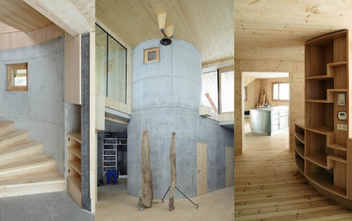 Spiralno stepenište smešteno unutar betonske cilindrične mase je probušeno mestimično sa borovim vratima i prozorima spaja gornje volumene.