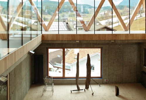 Projektovana za umetnika Huberta Kostnera, dvozapreminska struktura se izdiže impresivno na litici i skulpturisana je u obliku koji podseća na alpske pejzaže. Drvena struktura je pažljivo orijetisana ka severu kako bi se uvela jednaka, indirektna svetlost u kuću koja je vrlo važna za umetnike.