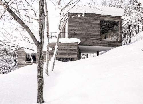 Smešteno između drveća, minimalističko odmaralište je izgrađeno preko eskarpe stvorene u preistorijskom dobu. Umesto da se ukopavaju u padinu planine, arhitekte su odlučile da podele kuću na dva dela i horizontalno pomere gornju polovinu kako bi se poravnala sa ivicom padine. Struktura je obložena u drvene panele svetle boje i ojačana sa betonskim zidom za bočno ukrućenje.