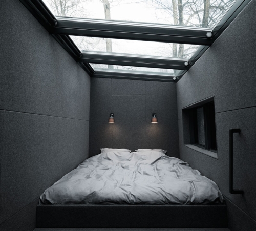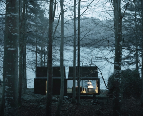 Čelični objekat od 55 metara kvadratnih izranja iz robusnog pejzaža uokviren sa staklenom fasadom koja održava okolno golo drveće i mirno jezero.