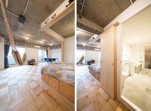Sa ulazom u kupatilo koje je smešteno u ulaznom holu, ono je prirodno van vidokruga iz većine stana i stoga sasvim diskretno. Krevet je, međutim, ugrađen u uglu jedinice i samim tim je veoma vidljiv. Kako bi se s ovim izborili, arhitekte su postavile klizna drvena vrata oko kreveta što mu omogućava da bude sakriven u toku dana ili kada su u stanu gosti.