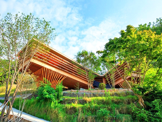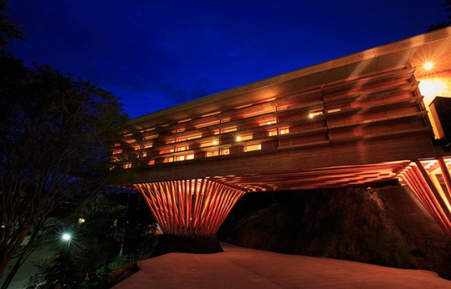 Izdužena kuća je smeštena na dva organski formirana nosača. Arhitekte iz biroa Life Style Koubou očekuju da će drvena konstrukcija vremenom dobiti istu patinu i boju kao i šuma koja je okružuje.