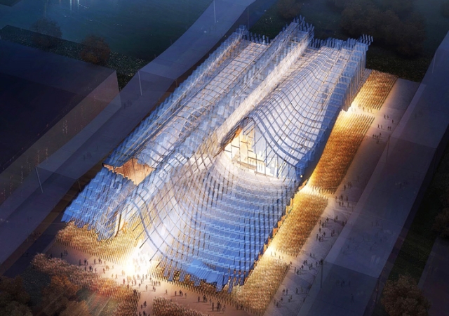 Pod nazivom „Zemlja nade“, projekat integriše kinesku tradicionalnu arhitekturu sa modernim tehnologijama. Njegov talasasti krov je projektovan kao drvena struktura koja podseća na tradicionalni kineski sistem podignutih greda, a paneli od šindre podsećaju na terakota krovne konstrukcije i pružaju paviljonu jedinstvenu siluetu. Natkriveni javni trg ispod se sastoji od kulturnih i izložbenih programa.