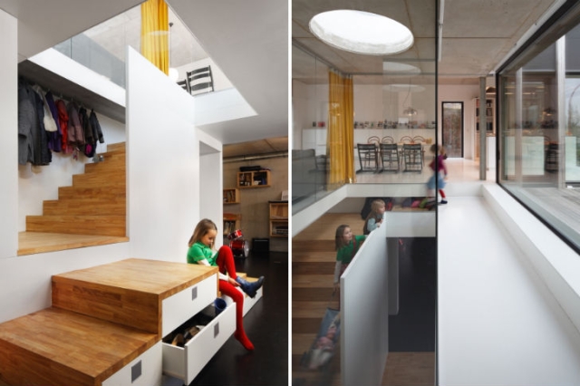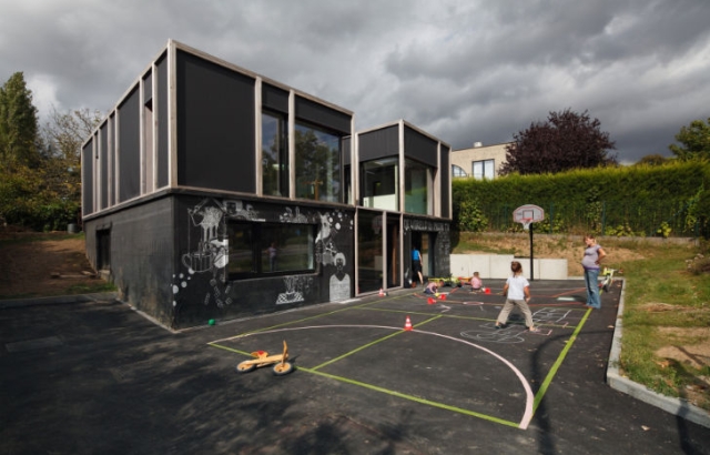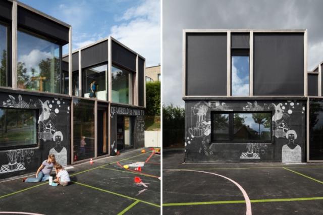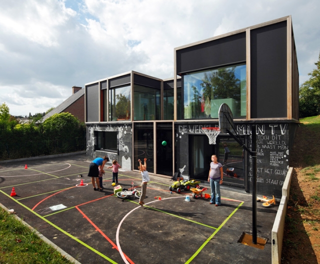 Obično se roditelji uznemire kada njihova deca crtaju po zidvoima - ali ne i u ovoj kući u Belgiji. Jednoporodični dom poseduje igralište umesto prednjeg dvorišta, a boja na kojoj se može crtati kredom pretvara celu kuću u dečiji umetnički projekat.