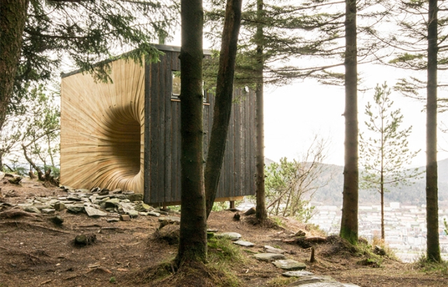 Ova planinska koliba ima čudan drveni ulaz u obliku tunela koji izgleda kao da vas može odvesti u neku drugu dimenziju. Smeštena na strmoj planini u Bergenu, ova soba sa pogledom je napravljena od strane studenata Arhitektonskog fakulteta, predvođeni arhitektom Espen Folgeroom iz biroa OPA Form architects.