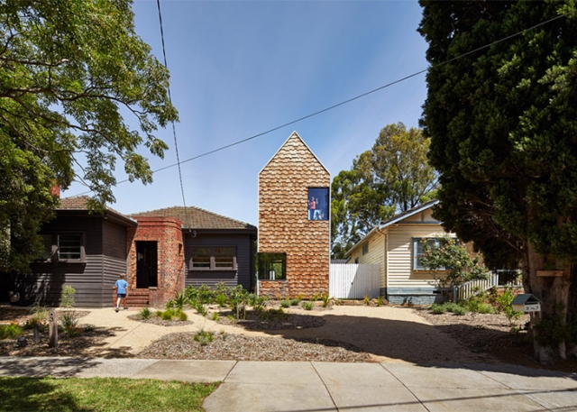 Umesto da ovo jednostavno proširi, arhitekta Majnard je dodao zabate obložene drvenom šindrom, od kojih je jedan jedini dvospratni deo strukture. Dodatak gornjeg nivoa ovog dela kuće je posvećen opuštanju i igranju sa podovima od mreža i obiljem svetlosti. Prvi sprat ove strukture je radna soba.