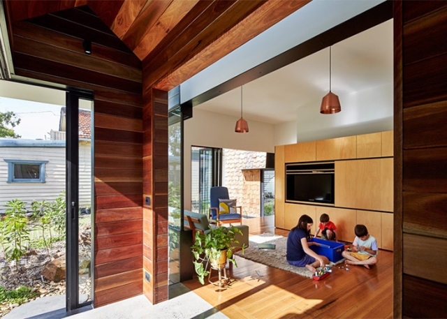 Kuća se može podeliti u dve odvojene zone ili može biti ostavljena otvorena. U postojećoj strukturi se nalaze dve spavaće sobe, dva dnevna boravka i kupatilo. Umesto dodavanja prilaza za kola u novi projekat, dvorište je pretvoreno u leju sa biljkama koju ceo komšiluk može da koristi.