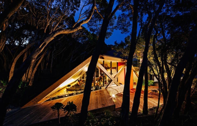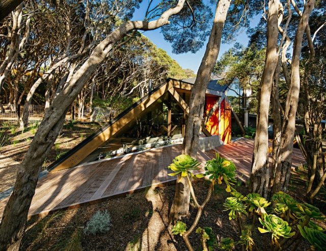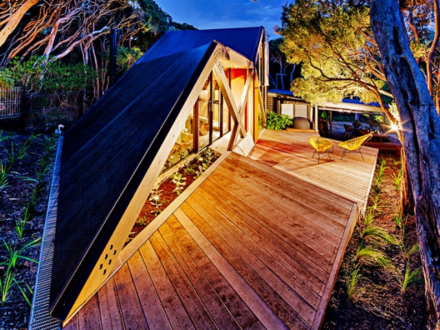 Arhitektonski biro Maddison Architects je proširio postojeći hotel iz 1960-ih u Australiji sa savremenim, ugaonim objektom izgrađenim od drveta i livenog betona. Ugrađena u padinu i okružena sa primorskim šumama, Koliba 2 je samostalna hotelska jedinica koja se vizuelno razlikuje od stare strukture. Savijeni krov strukture i prefabrikovani ram evoicira na brdovitu topogradiju regiona.