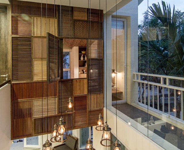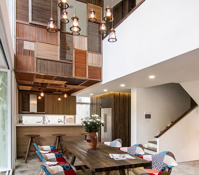 Veliki prostor duple spratne visine stvoren u centru zgrade smešta trpezarijski sto kao žižu prostora. Ova lokacija dobija najviše prirodne svetlosti i ventilacije u celoj kući. Pored prelepog visećeg rasvetnog elementa, dva pačvork bloka napravljenih od drvenih žaluzina okružuju trpezariju. Pačvork drvenih žaluzina pokriva zidove drugog sprata, kao i deo plafona u prizemlju, što pomaže u sakrivanju tehničkih sistema.