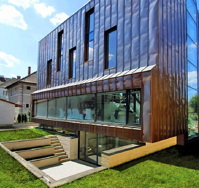 Minimalizam je bio ključni element u projektovanju Bakarne kuće. U tom cilju, arhitekta Teaca je obložio dvovodni krov kuće i fasadu u vertikalne trake od tamnog bakra koje naglašavaju vertikalnost kuće i dodaju „gotičku“ atmosferu.