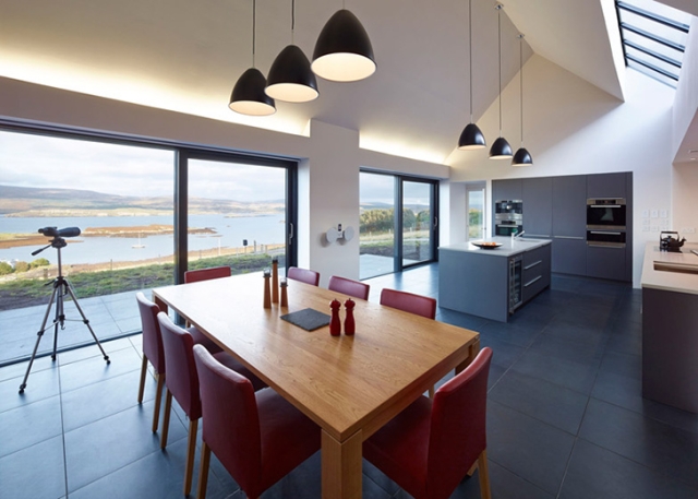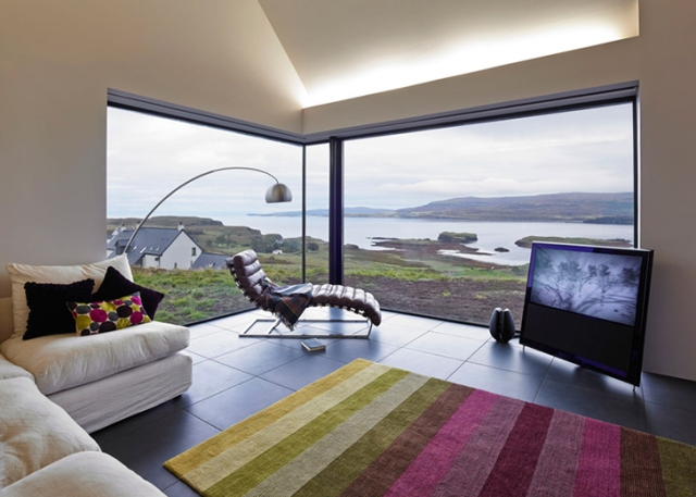 „Oblik je nastao iz želje da se izgubio veličina relativno velike zgrade u senci litice iza, tako da se jednoipospratni element koji sadrži sve spavaće sobe nalazi iza glavnog jednostavnog životnog prostora koji je smešten u prednjem delu“, rekle su arhitekte iz biroa Dualchas Architects.