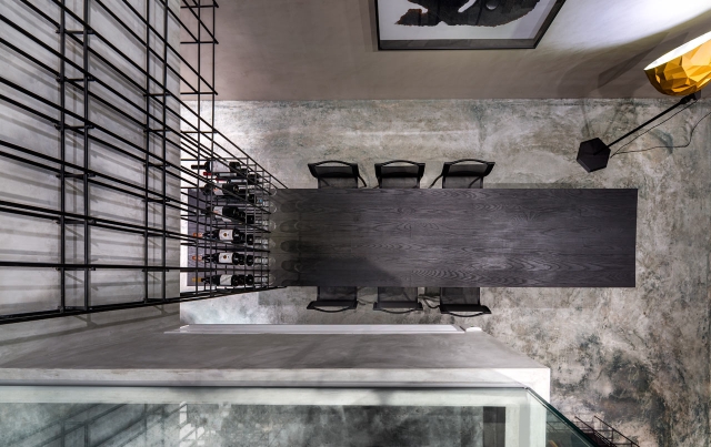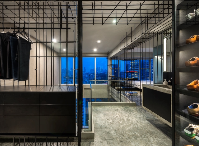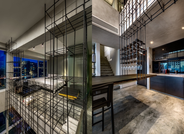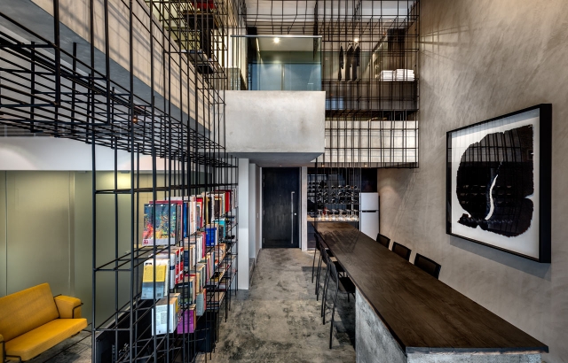 Monoform strutkura ima funkciju police za knjige, ormana, stola, police za vino, i što je najvažnije, umetničke skulpture u prostoru. Tanke, čelične šipke se pojavljuju u svakom delu stana, objedinjavajući dizajn.