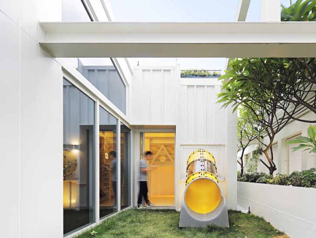 Arhitekte su takođe integrisale prostore za igru u okruženju nalik baštama, uključujući i tobogan kuću za decu.