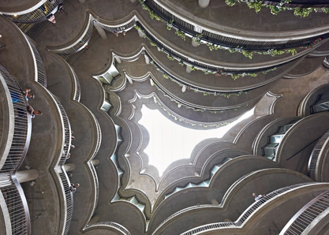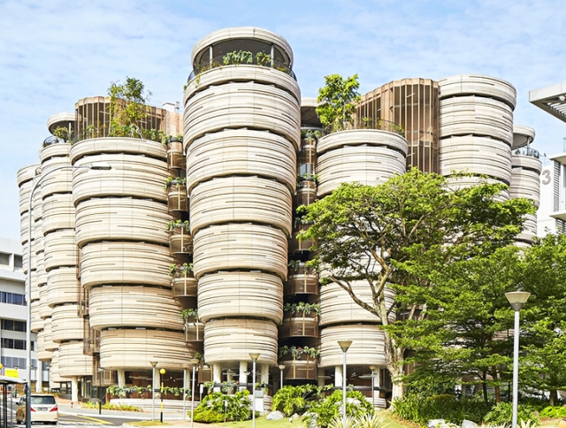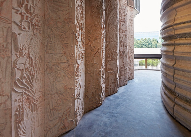 Atrijumom dominiraju balkoni koji postaju sve veći ka vrhu zgrade. Ovaj centralni prostor omogućava prirodnu ventilaciju i stvara neposredniju vezu sa spoljašnjim okruženjem. Zakrivljeni betonski paneli oblažu zgradu i oni imaju nepravilne horizontalne pruge koje daju organski izgled zgradi.