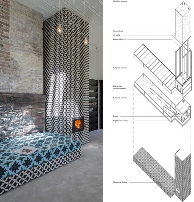 Dimnjaci za takve peći su tipično postavljeni vertikalno iznad njih i van zgrade. Međutim, zidana peć u Bafalo kafiću, projektovanom od strane arhitektonskog biroa Davidson Rafailidis Architecture i Arhitektonskog fakulteta Univerziteta u Bafalu, ima dimnjak koji se proteže horizontalno.