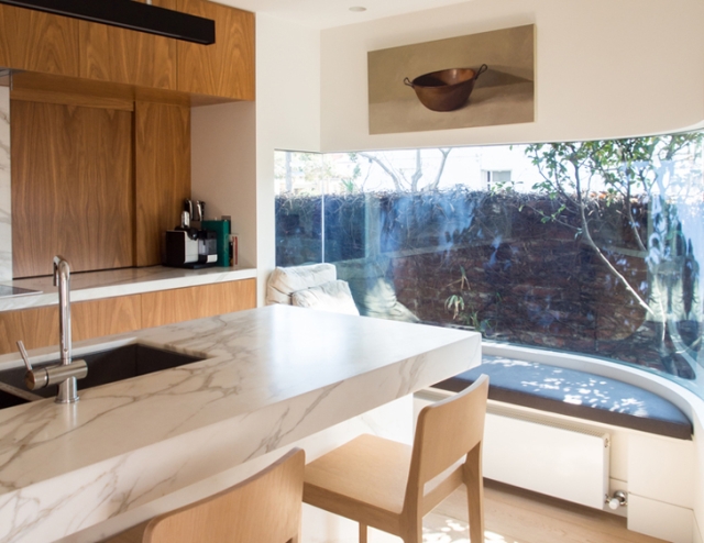 Zakrivljeno staklo omogućava stvaranje sedišta ispod njega koje se proteže ka celom dvorištu, dok se susedni veliki prozori otvaraju ka spolja, izlažući enterijer spoljašnjem vazduhu i pozadinskoj bašti.