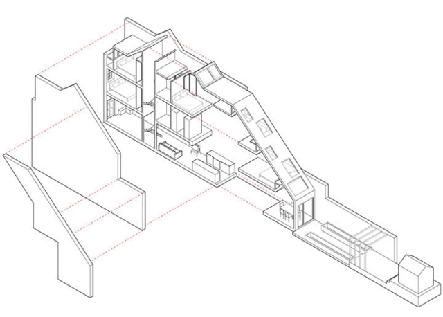Arhitektonski biro alma-nac je uspeo da izgradio produžetak kuće sa malim budžetom i u okvriu tesnog ograničenja prostora. Njegov kosi krov je umanjio troškove izgradnje, dok su terasasti svetlarnici omogućili prodor obilja dnevne svetlosti do najdubljih kutaka kuće.