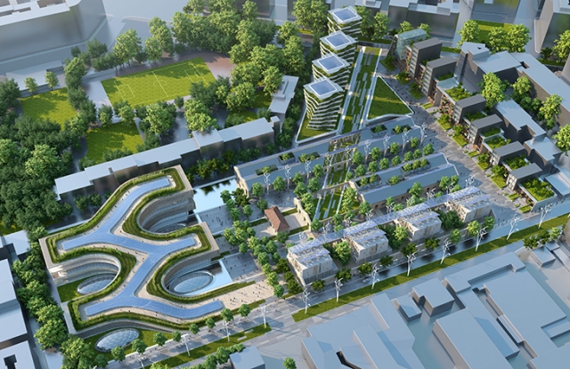Maloprodajni objekti, umetnički studiji, galerije, barovi i restorani se integrišu sa stambenim prostorima u cilju stvaranja samoodrživog grada u gradu Rimu. Svaki krov objekta će biti prekriven zelenilom koji se može koristiti za ishranu građana Grada nauke.