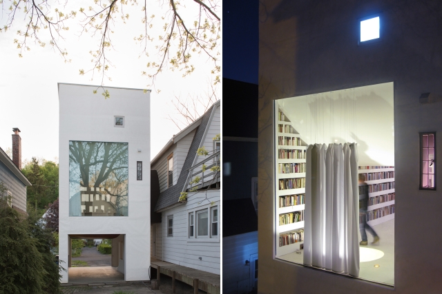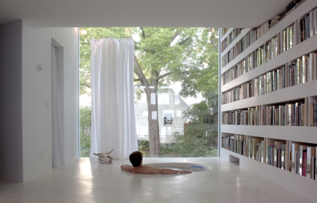 Indiferentnost unutrašnjosti kuće u odnosu na kontekst pruža miran prostor za rad uz maksimiziranje količine prirodne svetlosti kroz delove fasade strukture. Podela prostora u obliku činije odvaja pisaću sobu od čitaonice iznad, povećavajući indirektno svetlo za drugi nivo i izbegavanjem bilo kakve veze sa okolinom na prvom.