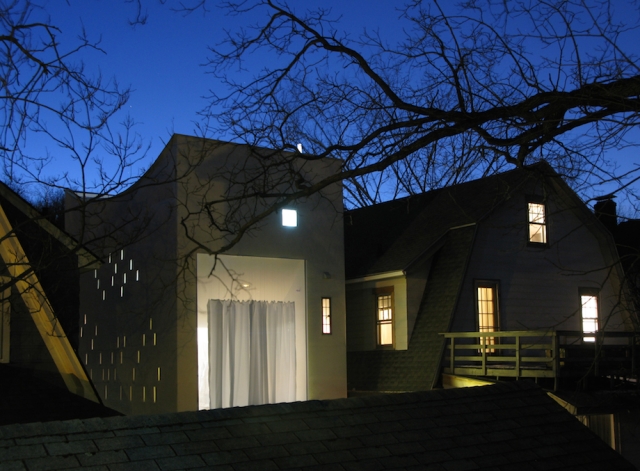 Studio se spaja sa postojećom kućom vlasnika na drugom nivou, ali je u svemu drugome zasebna struktura. Ona se prilagođava prigradskom kontekstu u kome se nalazi i ponavlja sliku „kuće“ stvaranjem praznog prostora za kontemplaciju, odmor i pisanje.