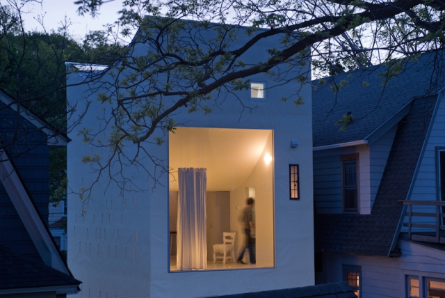 Eksterijer koji je obmotan u providnoj silicijumom impregniranoj tkanini pruža filtriranu svetlost za enterijer bez ikakve vizuelne veze sa okolinom. U zadnjem dvorištu, tkanina se koristi u enterijeru kao zavesa, nudeći vlasnicima fleksibilnost da kontrolišu svoju privatnost.