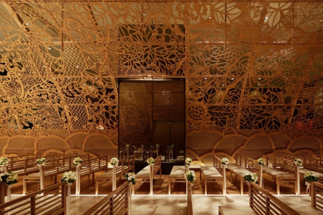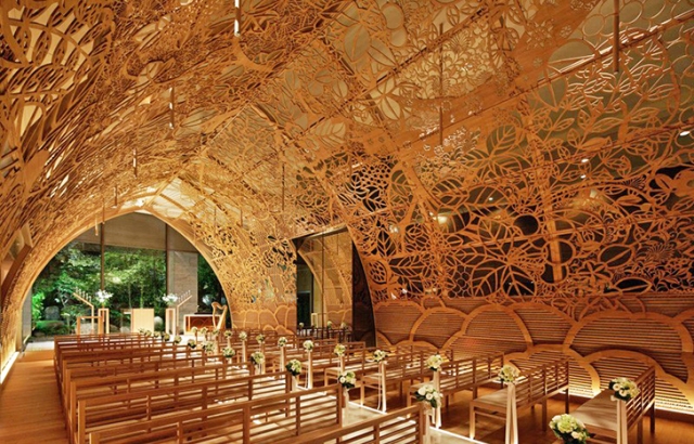 Arhitektonski biro Nikken Space Design je uveo neobičnog partnera u izradi neverovatnog projekta kapele za venčanje: dizajnera kimonoa. Oslanjajući se na japanski dizajn kimonoa, arhitekte ove ručno obrađene drvene tavanice su pronašli način da uvedu ne samo prirodu, već i da ispoštuju japansku tradiciju sa ovom kapelom za venčanja.