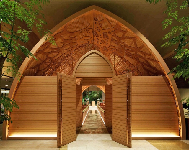 Rezbarije drveća i lišća ne samo da stvaraju umirujuću atmosferu, već i pružaju poetski značaj prostoru. Ručno rezbareni dizajn odlikuju slike korenja, stabala, lišća i cveća jednog drveta, što ima za cilj da pruži venčanim parovima vezu sa svojim precima.