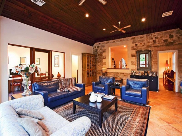 Unutar vrata u obliku luka, posetioci nailaze na dnevnu sobu dvostruke spratne visine. Unutrašnjost je transformisana u ultra moderan prostor, sa elegantnim belim zidovima koji vode do rustičnog drvenog plafona.