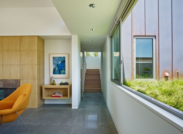 Dok je eksterijer obložen u kombinaciji prirodnih i recikliranih materijala i suptilno zasenčenih fibrocementnih panela, metalni paneli bakarne patine i bronzom obložen cink pomažu u identifikaciji posebnih funkcija u unutrašnjosti kuće.