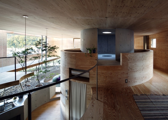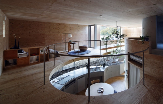 Šest tipova betonskih podnih nivoa, uključujući i kružni pod koji je stvoren iskopavanjem površine, su spojeni sa betonskim cilinidričnim jezgrom u centru kuće, koji u nekom delu izgleda nalik amfiteatru.