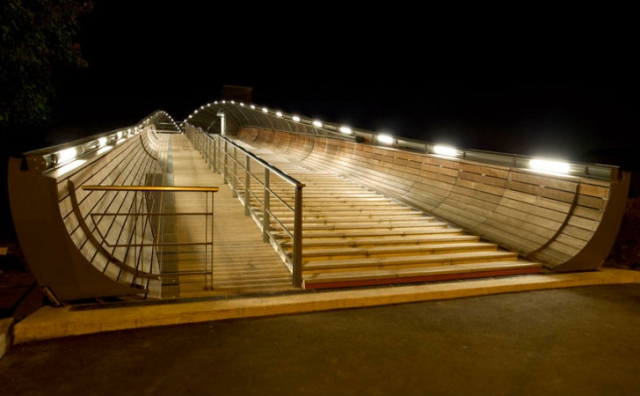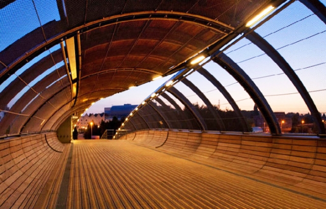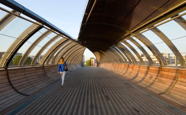 Čelični i drveni most izlazi iz tla i uvija se poput vlati trave ili lista. Most je otvoren na oba kraja i uvija se u centru kako bi zaštitio korisnike od vremenskih prilika, buke i izloženosti.