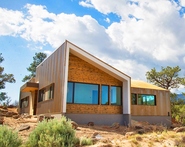 Ugaoni čelični krovovi crveno-narandžaste boje oponašaju formacije crvene stene i pružaju snažan kontrast okruženju sa čvornatim drvećima smreke koje se nalaze na parceli.