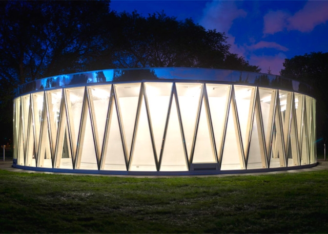 Zakrivljena zgrada je prekrivena sa trouglastim reflektujućim panelima koji čine da paviljon „nestane“ u okolni pejzaž tokom dana. Cik-cak ramovska konstrukcija Paviljona u Borden parku je izgrađena od laminirane glulam duglazije i smešten ja na betonskom temelju.