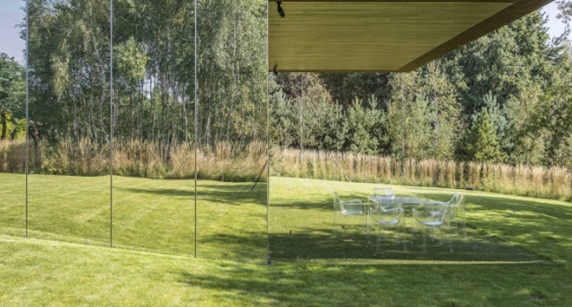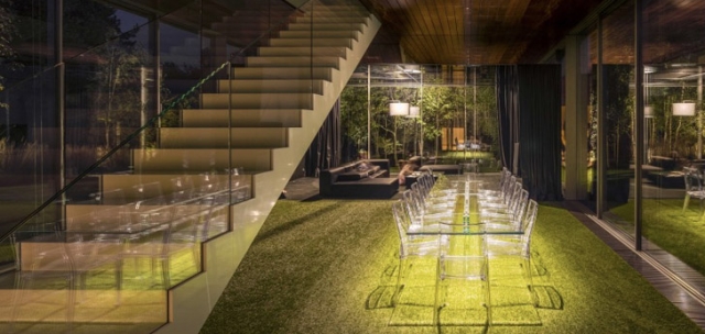 Oivičen pomerljivim staklenim zidovima, trava bašte se nastavlja u enterijer ispod platforme sa sintetičkim travnjakom, stvarajući nadrealno iskustvo. Tokom letnjih meseci, stakleni zidovi se mogu ukloniti, spajajući dnevni prostor sa baštom.