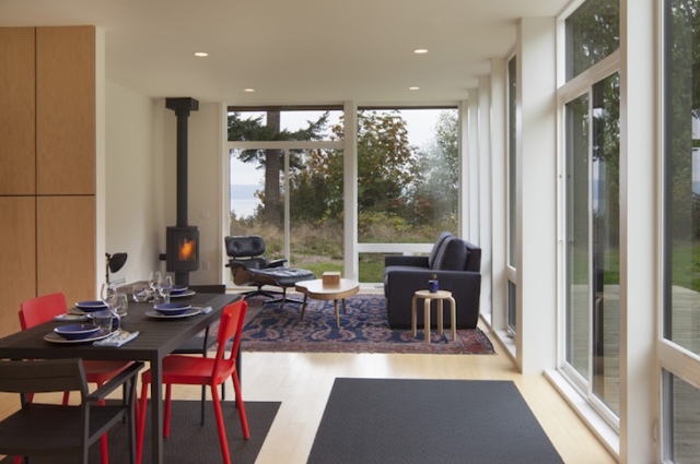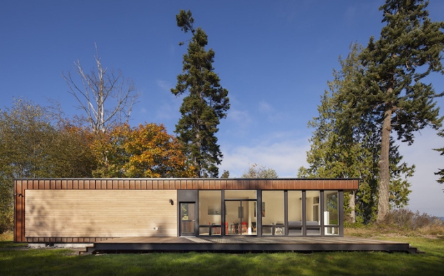 Pored velikih prozora koji uokviruju poglede na priobalje, moderna prefabrikovana kuća je obložena u panelima od kedrovine i korten čelikom. Trem u obliku slova L se obavija oko kuće i nudi produžetak dnevnog boravka. Enterijer je završen sa bambus podovima i ručno izrađenim nameštajem od javora.
