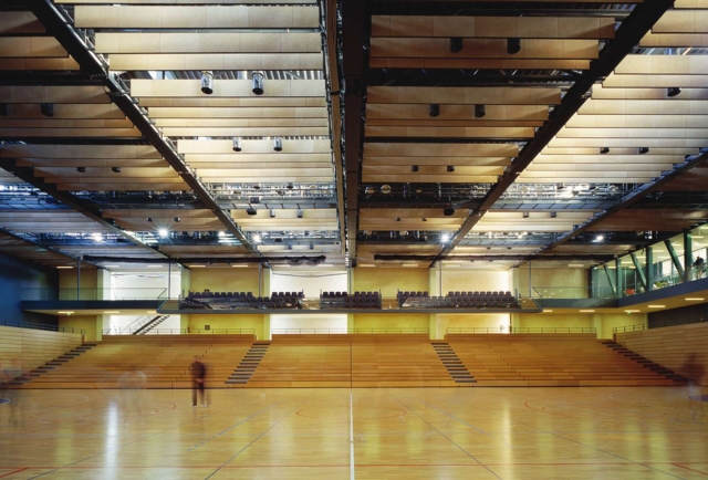Prirodno osvetljene sportske sale pružaju auditorijum sa 2.380 sedišta, koji koristi teleskopski sistem tribina, što mu omogućava lagano i brzo prilagođavanje različitim upotrebama, proširujući upotrebljivost prostora.
