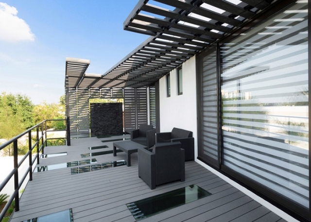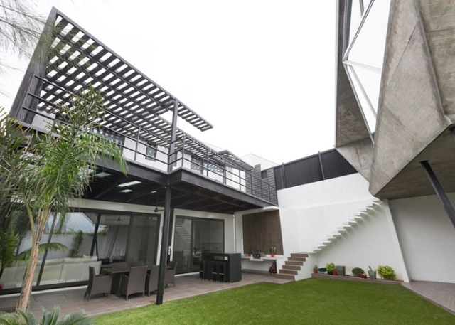 Uprkos njihovom kontrastnom izgledu - jedan deo prati ugaone betonske oblike, dok drugi ima ortogonalni izgled nalik rešetkama - strukture stvaraju okruženje koje deluje dosledno i kompatibilno sa postojećom kućom.