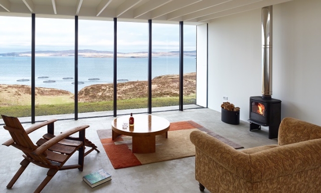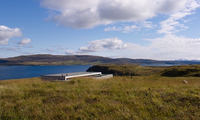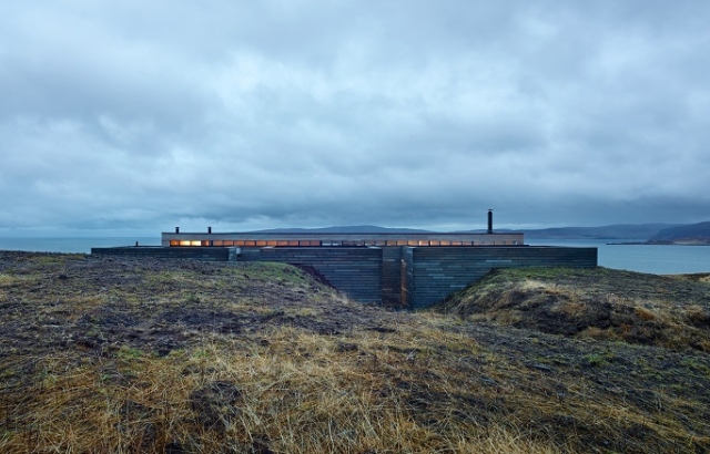 Delimično ukopana u zemlju radi poštovanja prirodne topografije lokacije, krovna linija doma obloženog arišom i kamenom sedi skoro u ravni sa travnatim pejzažom, čineći dom skoro neprimetnim izdaleka. Niska kuća sa dve spavaće sobe je izgrađena od prirodnih materijala i zastakljena na severnoj i zapadnoj strani radi spektakularnih pogleda na more.